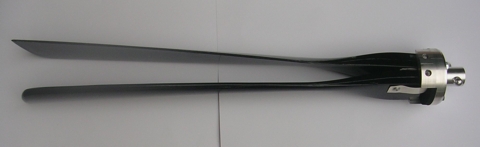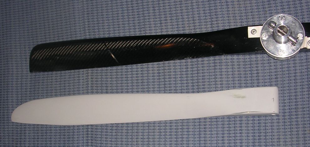 Das Modell des neu designten Propellers (grau). Durch schmälere Blattspitzen und Verringerung der Schänkung im Aussenbereich ist eine Reduzierung des Propellergeräuschs sowie ein besserer Wirkungsgrad angestrebt. |