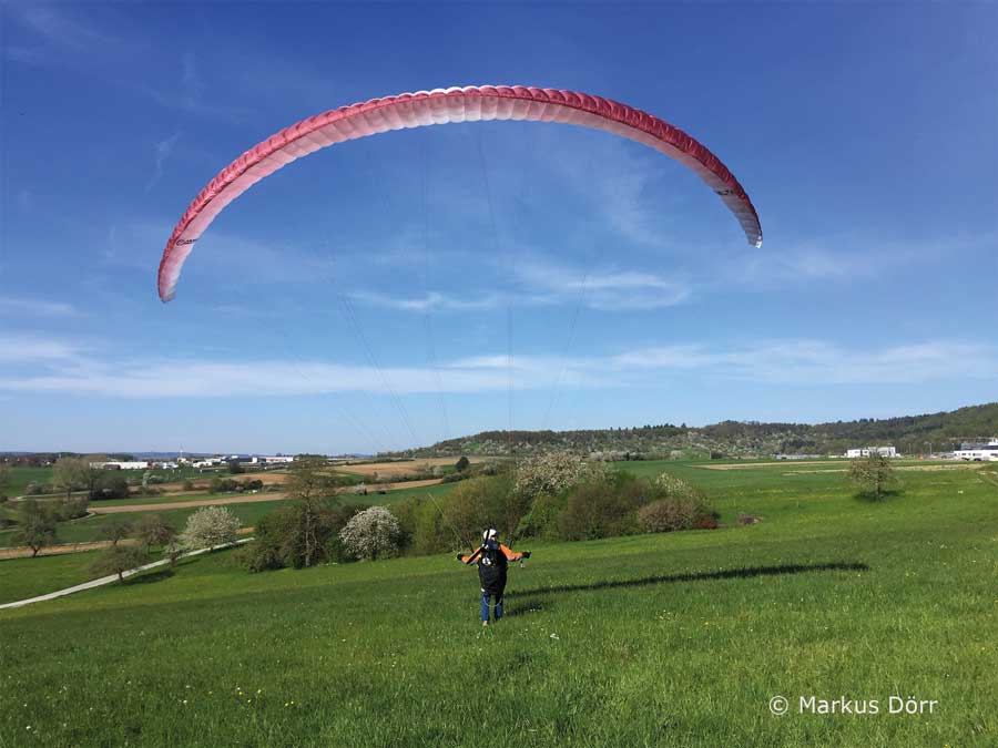der Umbau der Schirmaufhängung, wurde noch nicht getestet. Der Probeflug war