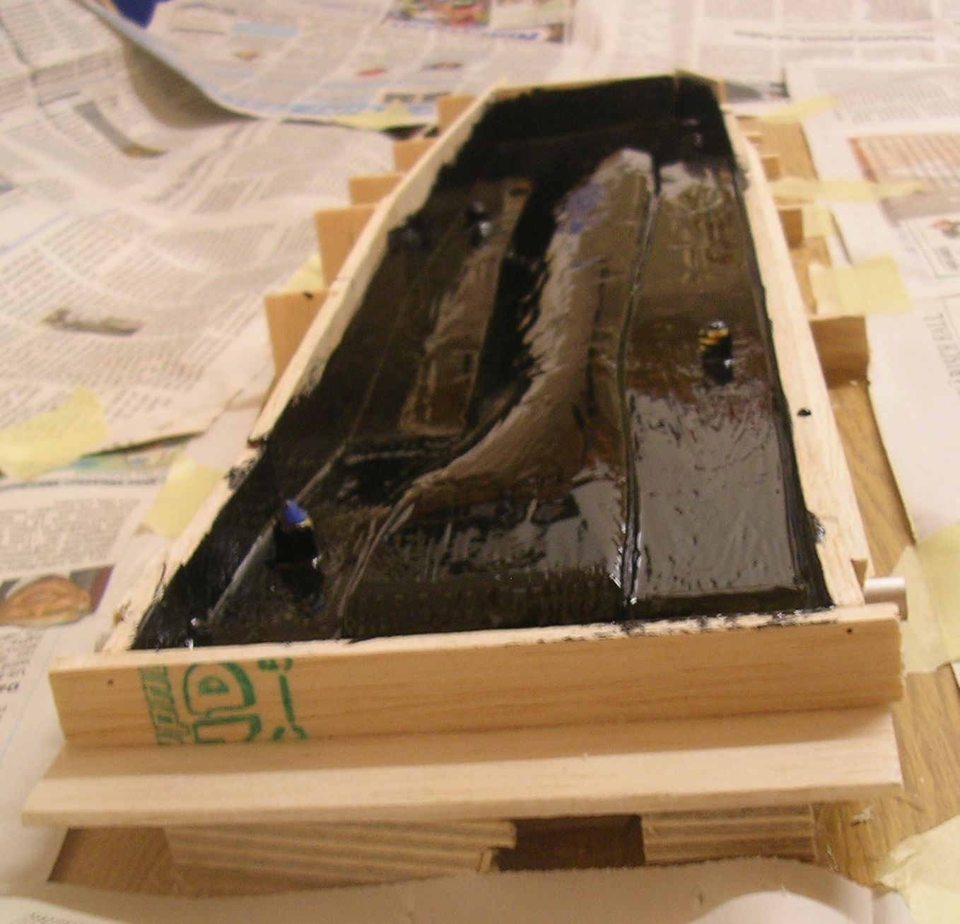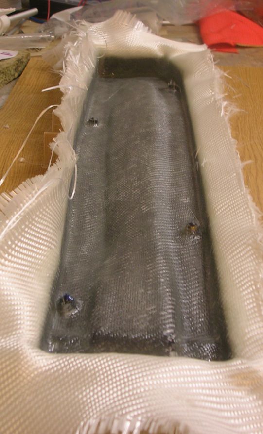 Erstellung der Negativform: ganz links wurde der Formkasten gerade mit einer Feinschicht ausgekleidet. Rechts daneben die fertig laminierte erste Negativhalbschale während der Aushärtephase. |