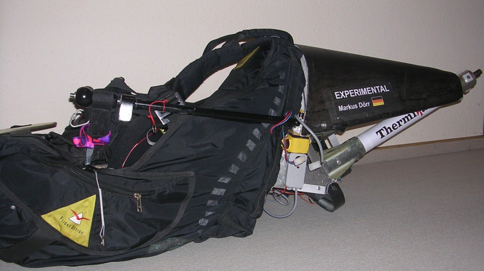 Technische Daten Motorleistung: 5kW Akku-Nennspannung: 44,4V Akkukapazität: 8Ah Propeller: 110 cm Duchmesser Gewicht: 19,8kg flugfertig mit Gurt, Akku, Propeller, Rettung (Supair M), Schaumprotektor, |